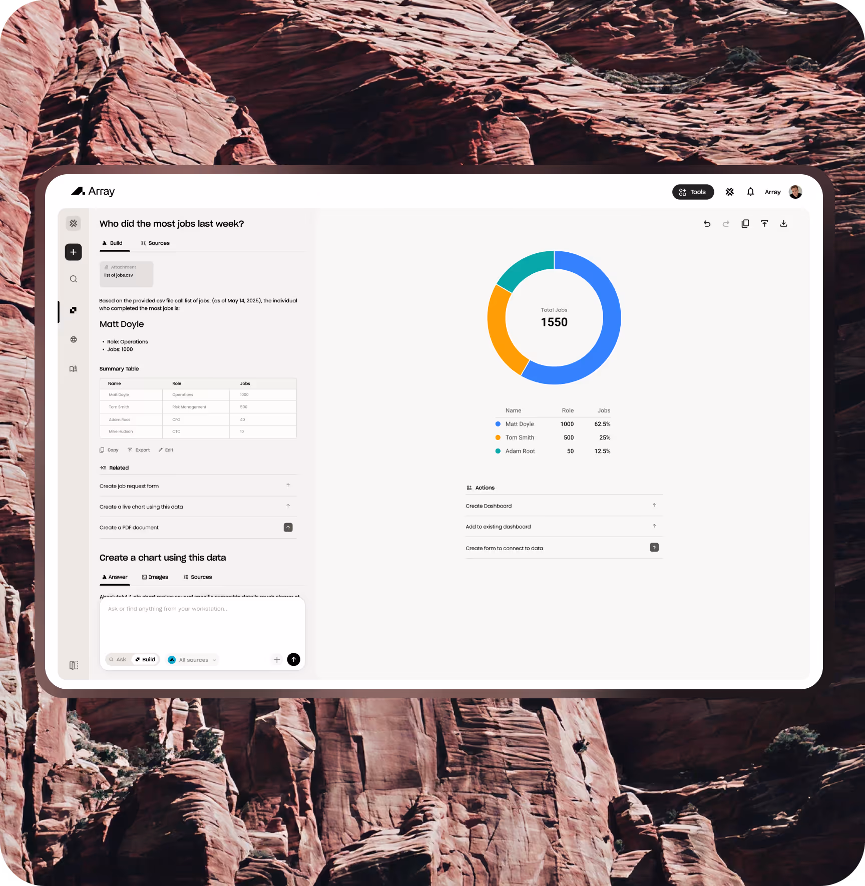 Go beyond static reports. Ask BuckAI to create graphs, pie charts, or entire dashboards for you — and they stay live, automatically updating as new data comes in. Each visualization connects to your real data sources, giving you a living, breathing view of performance across your organization.