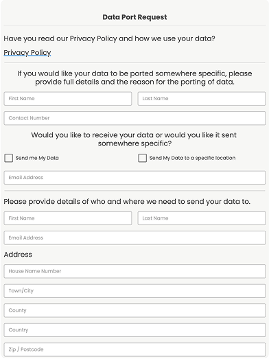 A request to port the personal data you collect upon someone. This form can be submitted by a client to inform you how they want their data to be sent and will provide confirmation for both you as the data handler and the request of the client for their data to be moved.